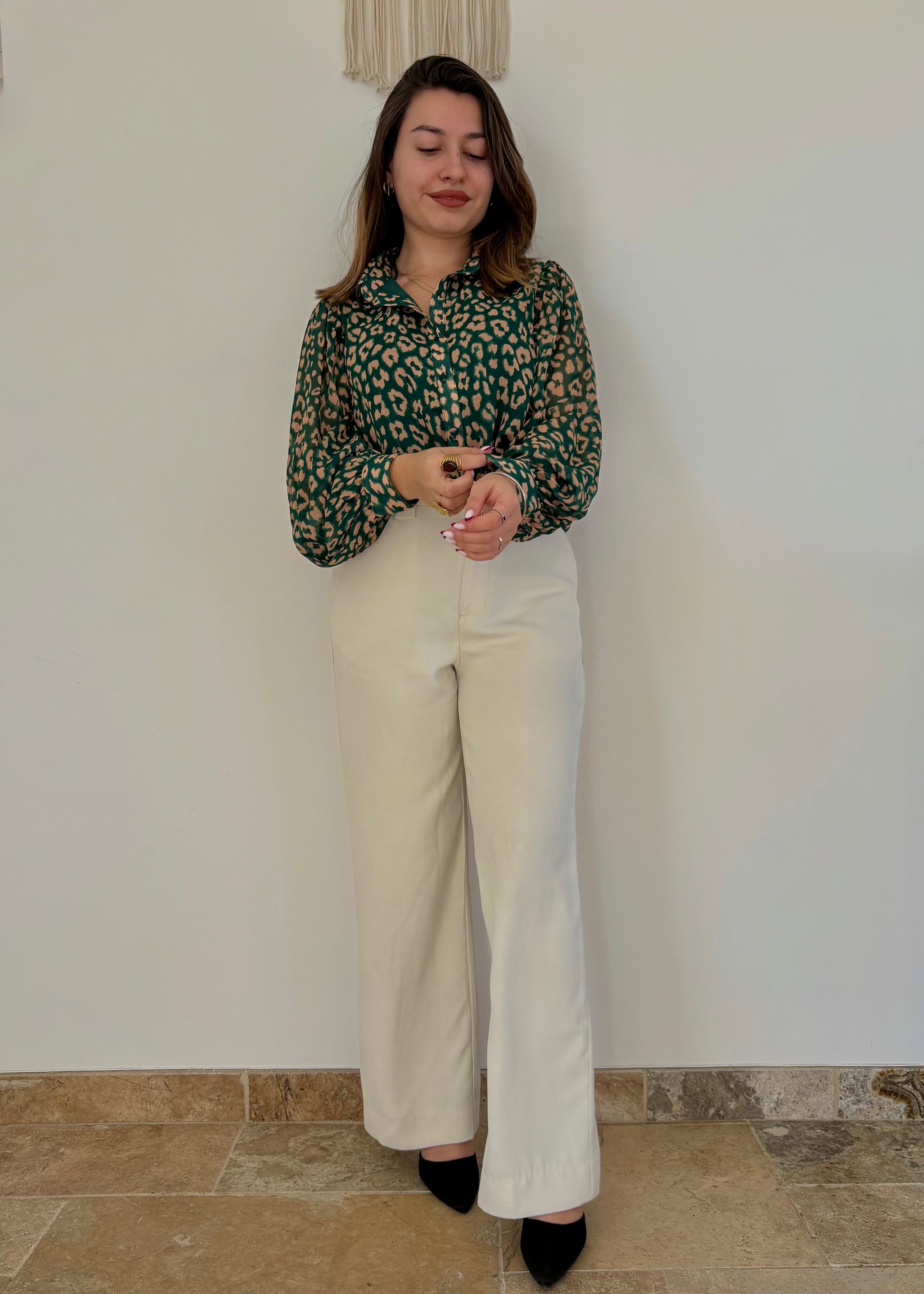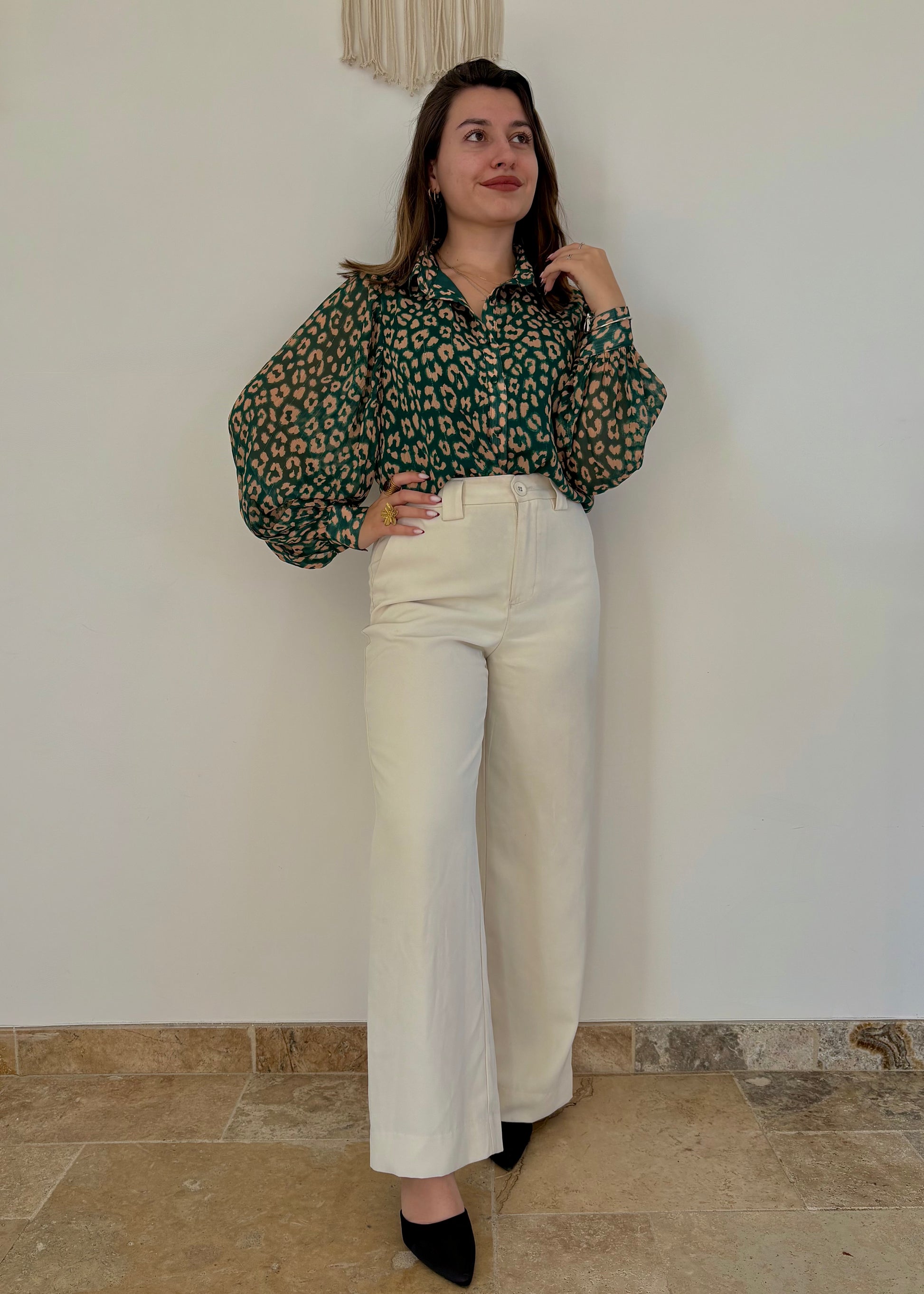 Avec sa coupe droite et ses manches bouffantes, elle apporte une allure chic. Son vert sublimé par des motifs léopard beige et de délicats liserés dorés en fait une pièce, à la fois féminine et raffinée. Le devant doublé assure un tombé parfait et un confort optimal.