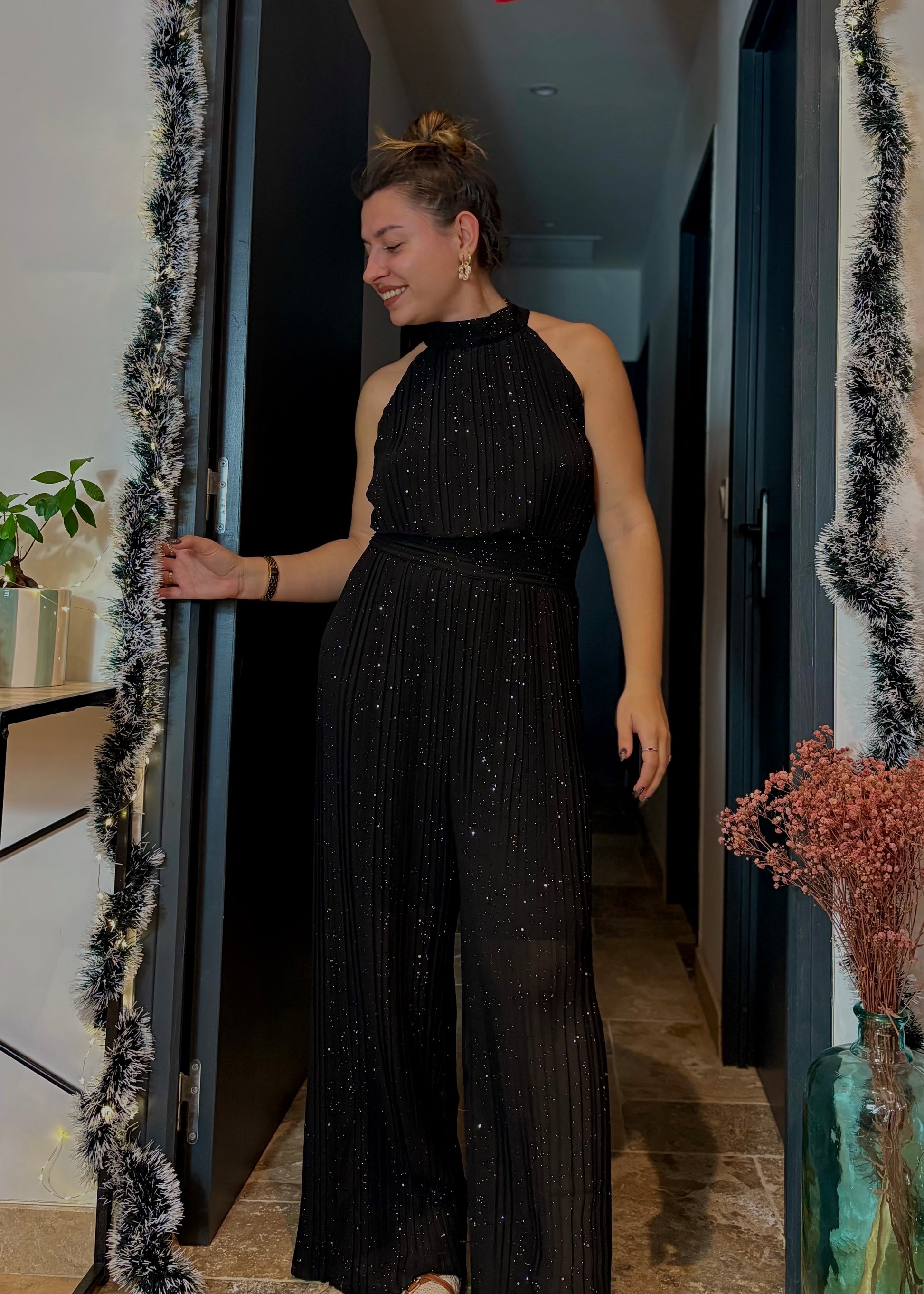 Cette combi-pantalon marie glamour et raffinement. Sa taille élastique souligne la silhouette tandis que son dos nu discret, fermé par deux petits boutons à la nuque, apporte une touche délicate. Le pantalon plissé et les petites paillettes subtiles illuminent l’ensemble pour un look festif ultra chic. Doublée avec une doublure short, elle offre confort et élégance à chaque mouvement.