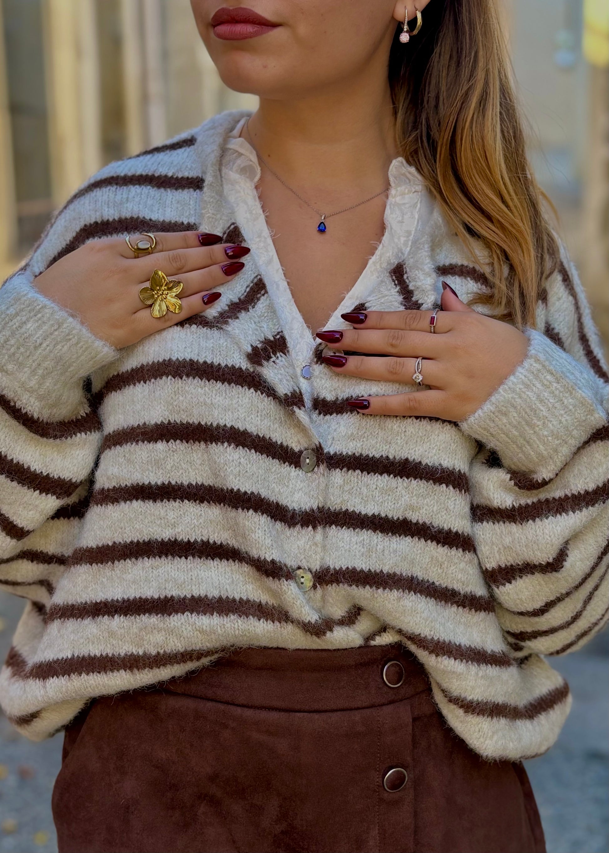 Super douillet et confortable, ce gilet écru à rayures marron est ultra tendance cette saison. Ses boutons peuvent se porter devant ou derrière, et il se porte parfaitement ouvert ou fermé 🥰