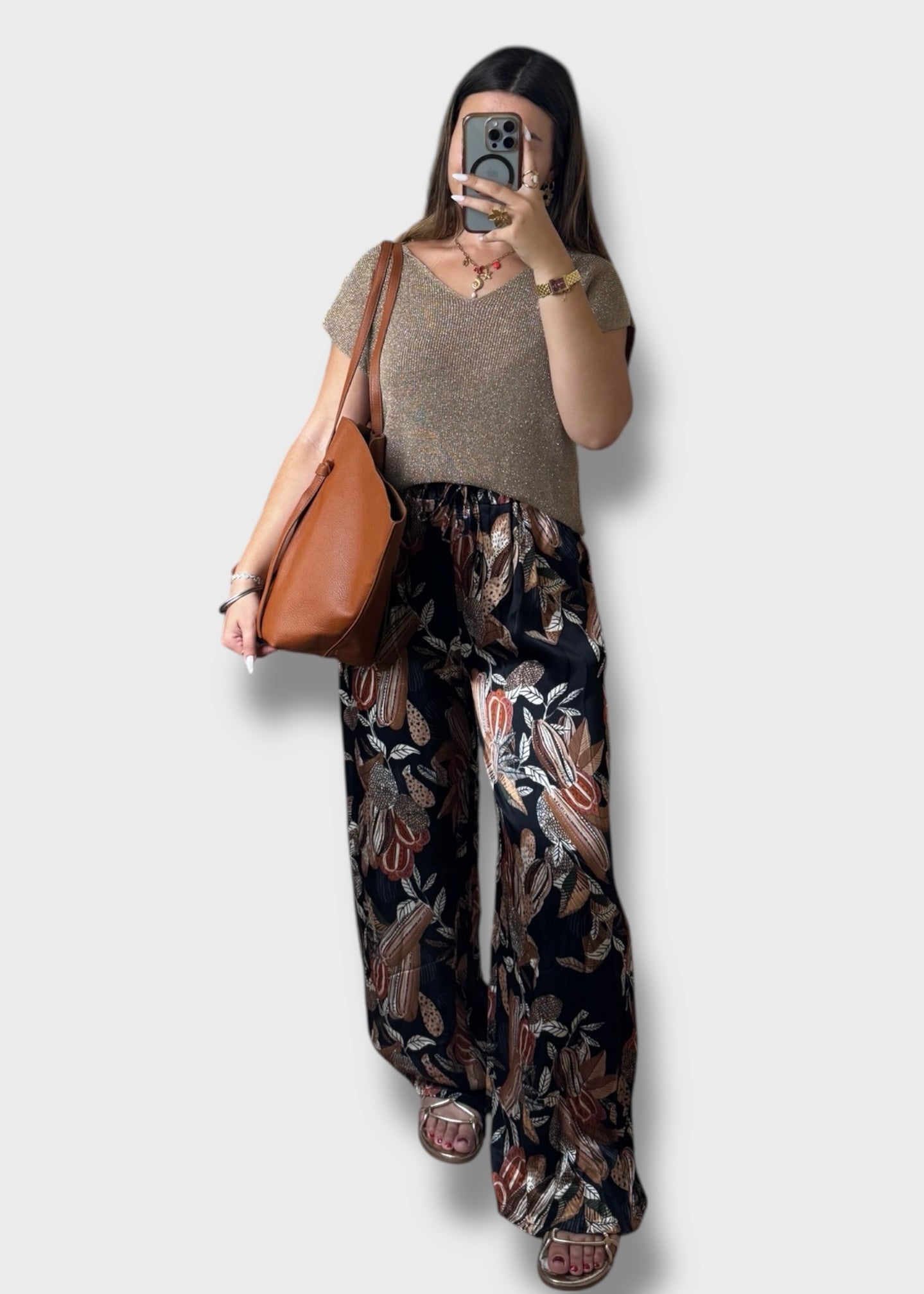 Ce pantalon à motifs imprimé en viscose satinée effet soie combine confort et style. Sa coupe légère et sa taille ajustable grâce à la ficelle à nouer en font la pièce parfaite pour un look chic et décontracté, idéale pour l’automne ! 🍂