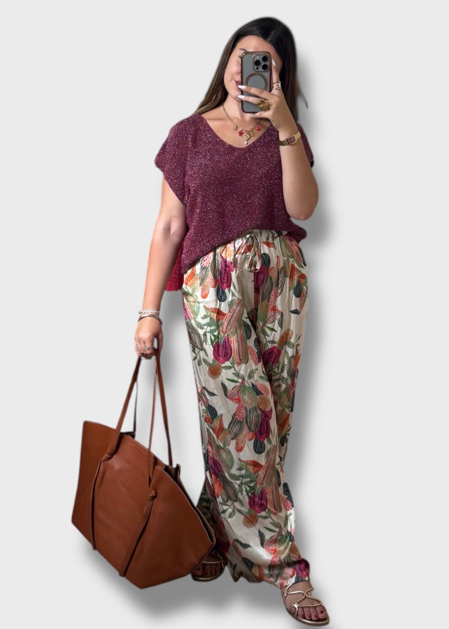 Ce pantalon à motifs imprimé en viscose satinée effet soie combine confort et style. Sa coupe légère et sa taille ajustable grâce à la ficelle à nouer en font la pièce parfaite pour un look chic et décontracté, idéale pour l’automne ! 🍂