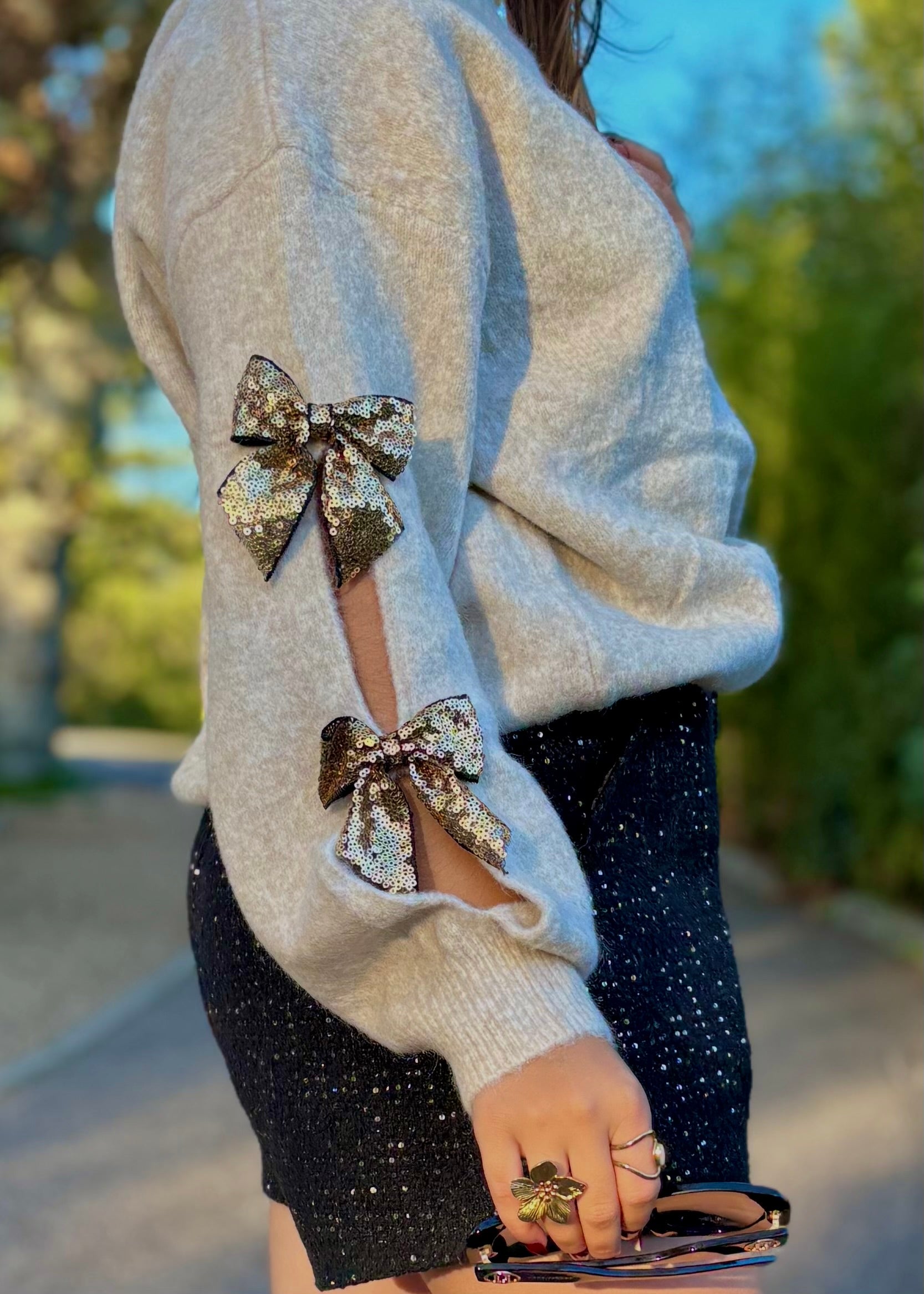 Le pull Anaë, le pull original avec une coupe moderne. Ses manches originales apportent une touche féminine et raffinée, pour un look élégant et facile à porter. Le petit détail qui rend ce pull unique : ses manches avec deux noeuds à sequins.
