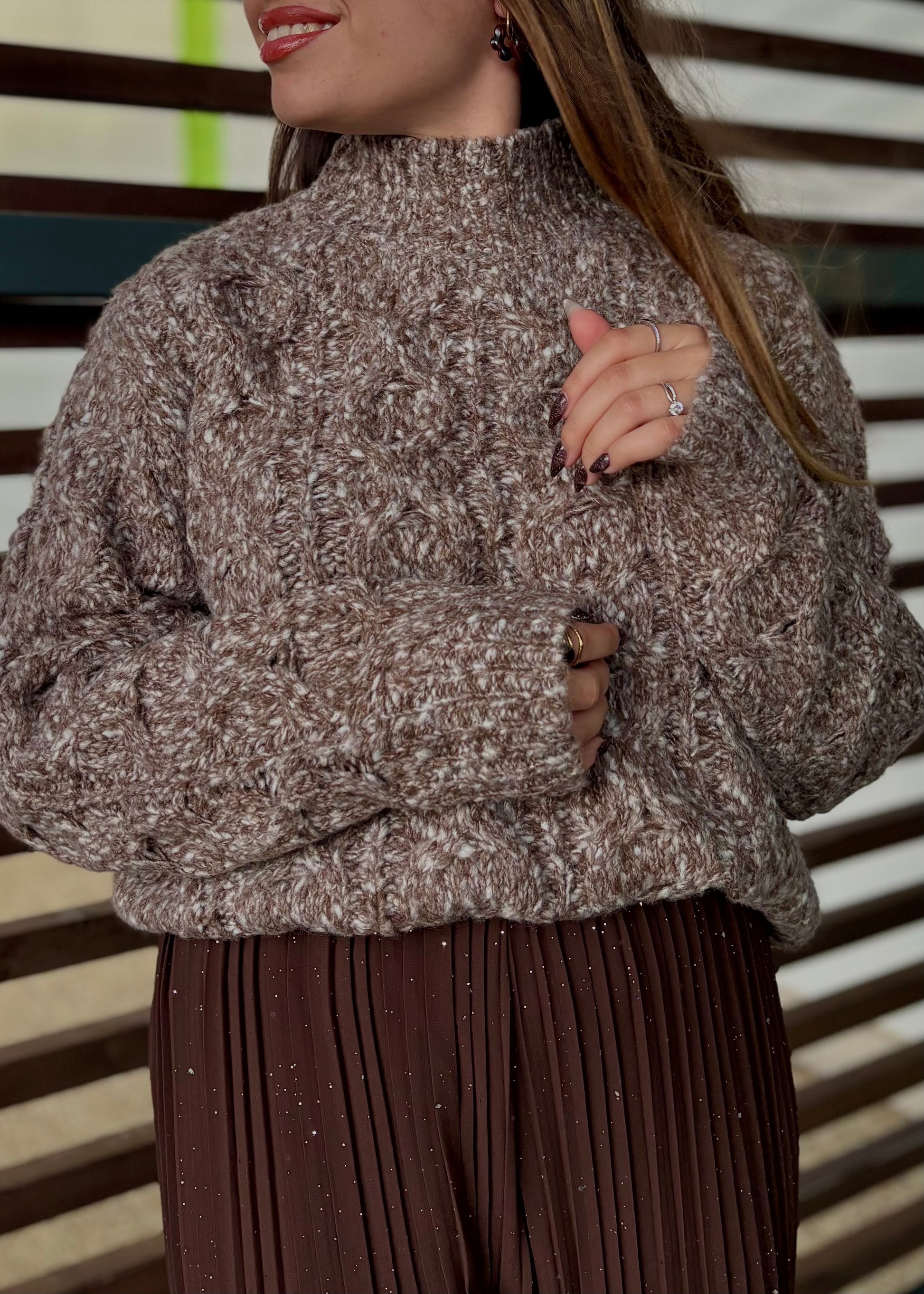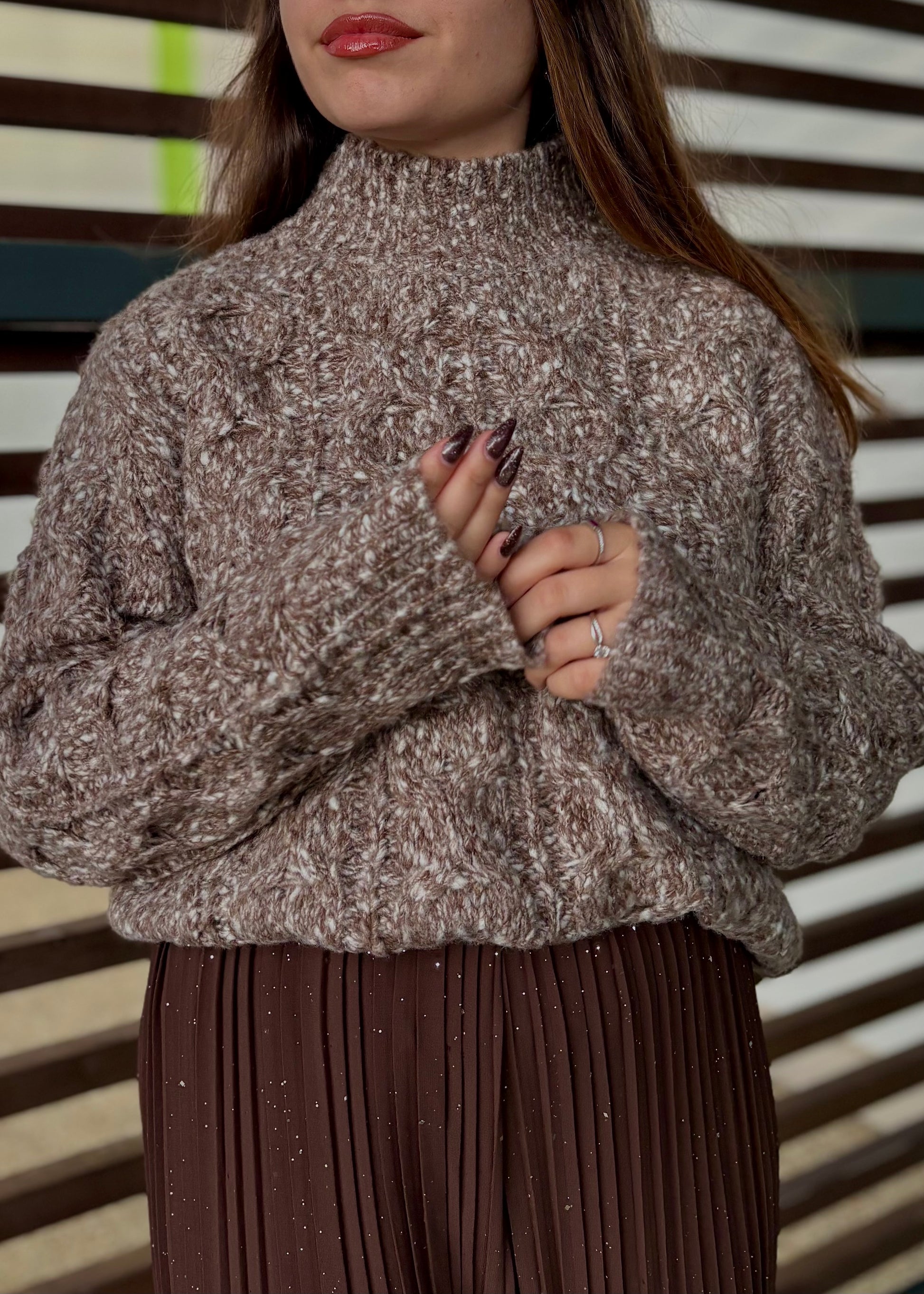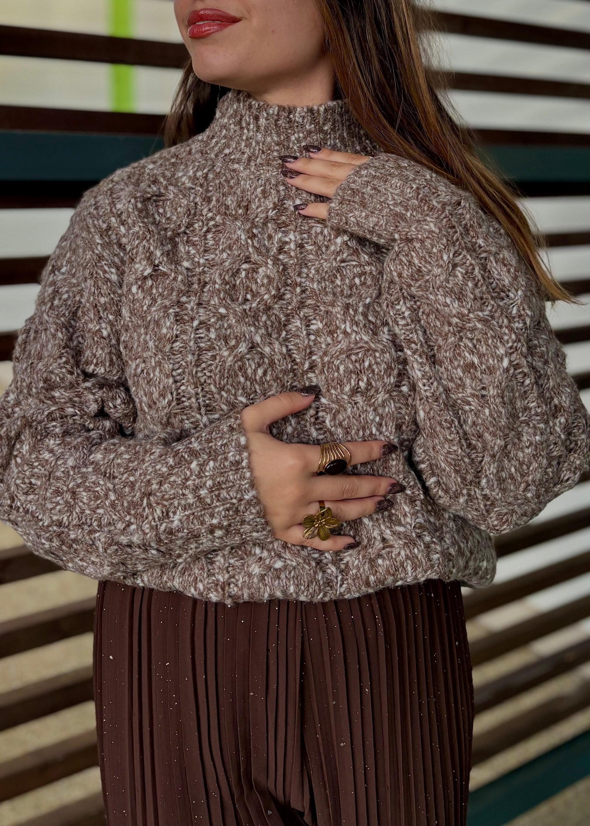 Avec son mélange subtil de gris et de marron clair, ce pull unique apporte une touche chic et moderne à vos tenues hivernales. Son col montant élégant et sa maille chaude en font une pièce aussi stylée que confortable, parfaite pour affronter les journées fraîches avec allure.