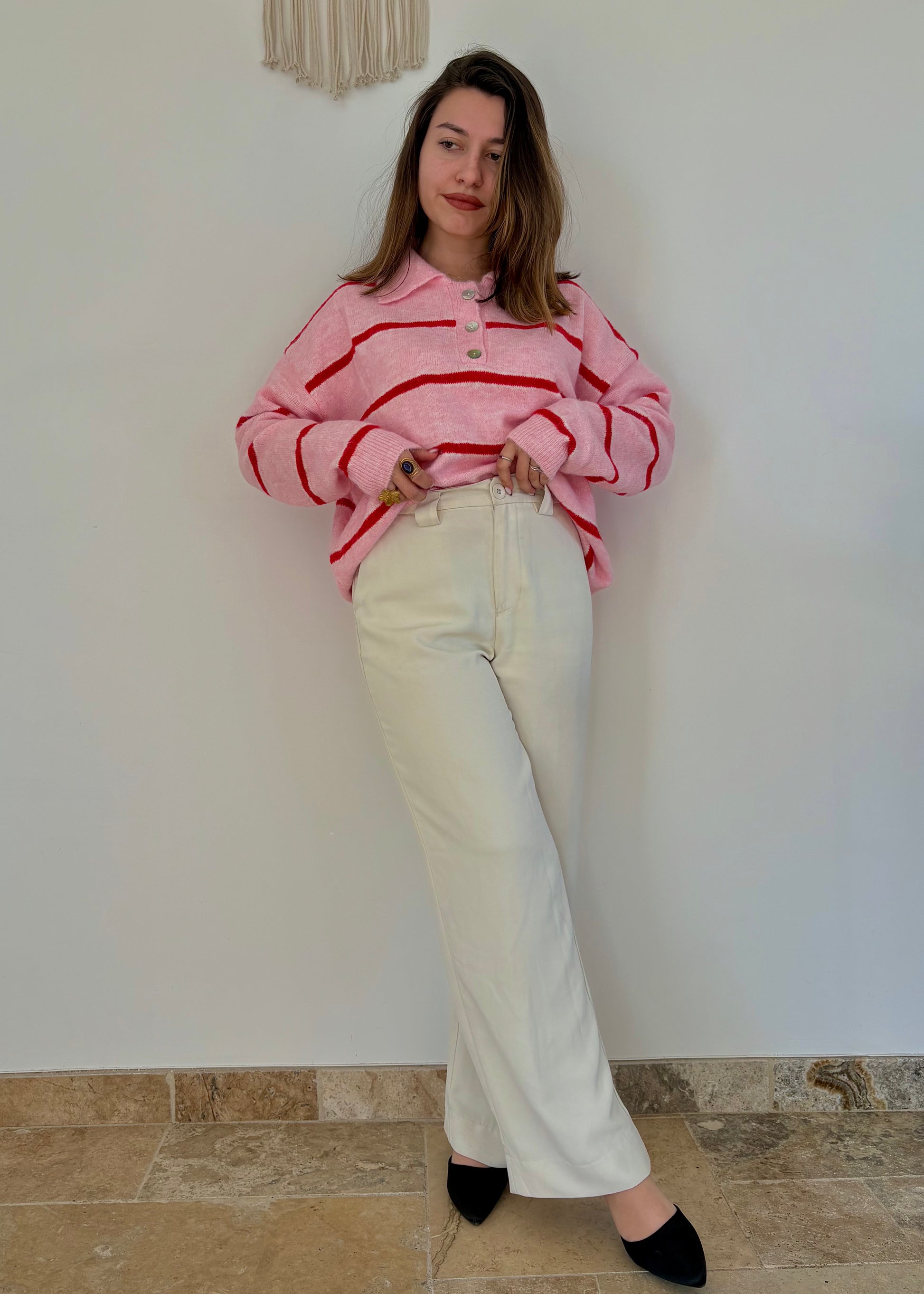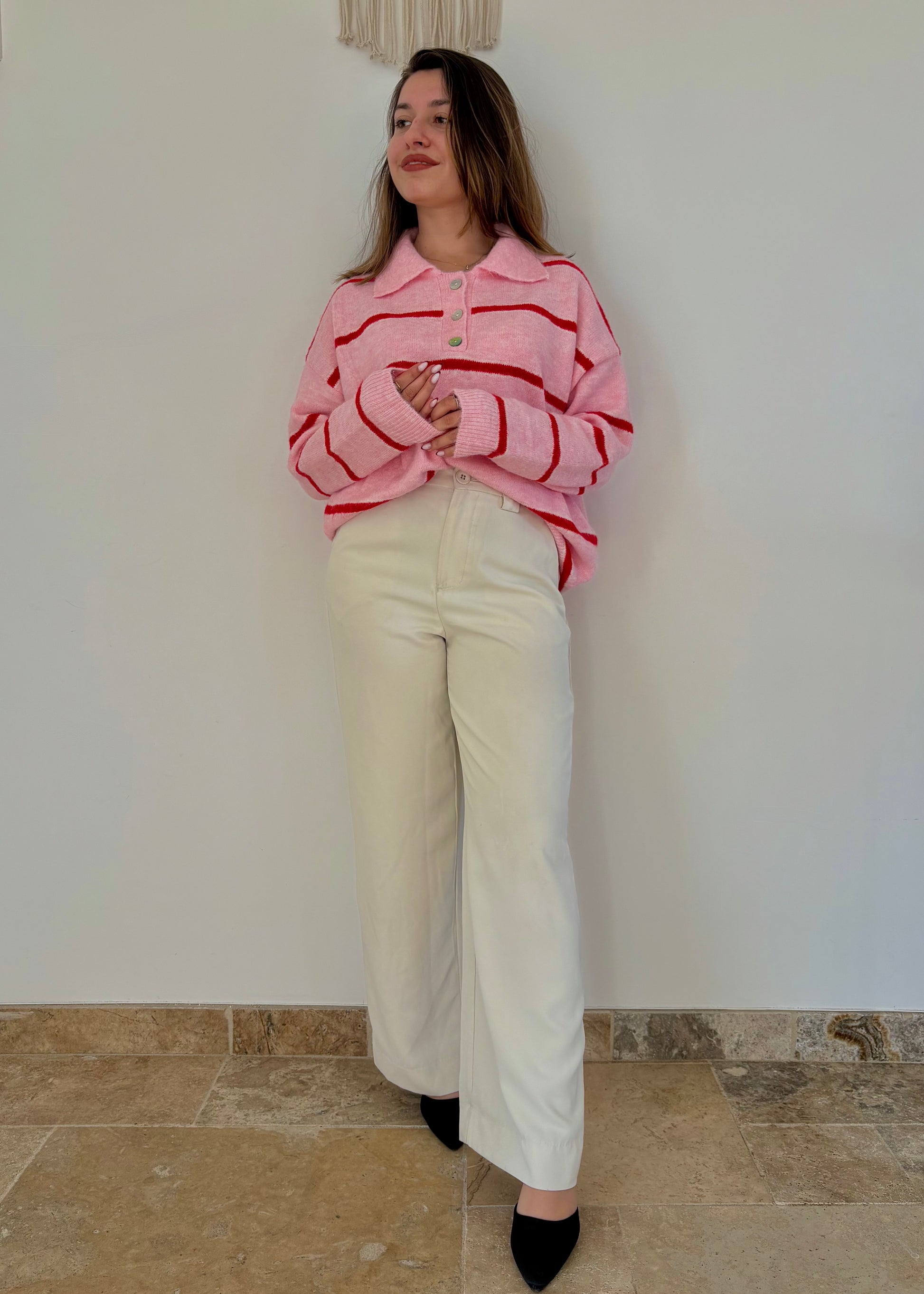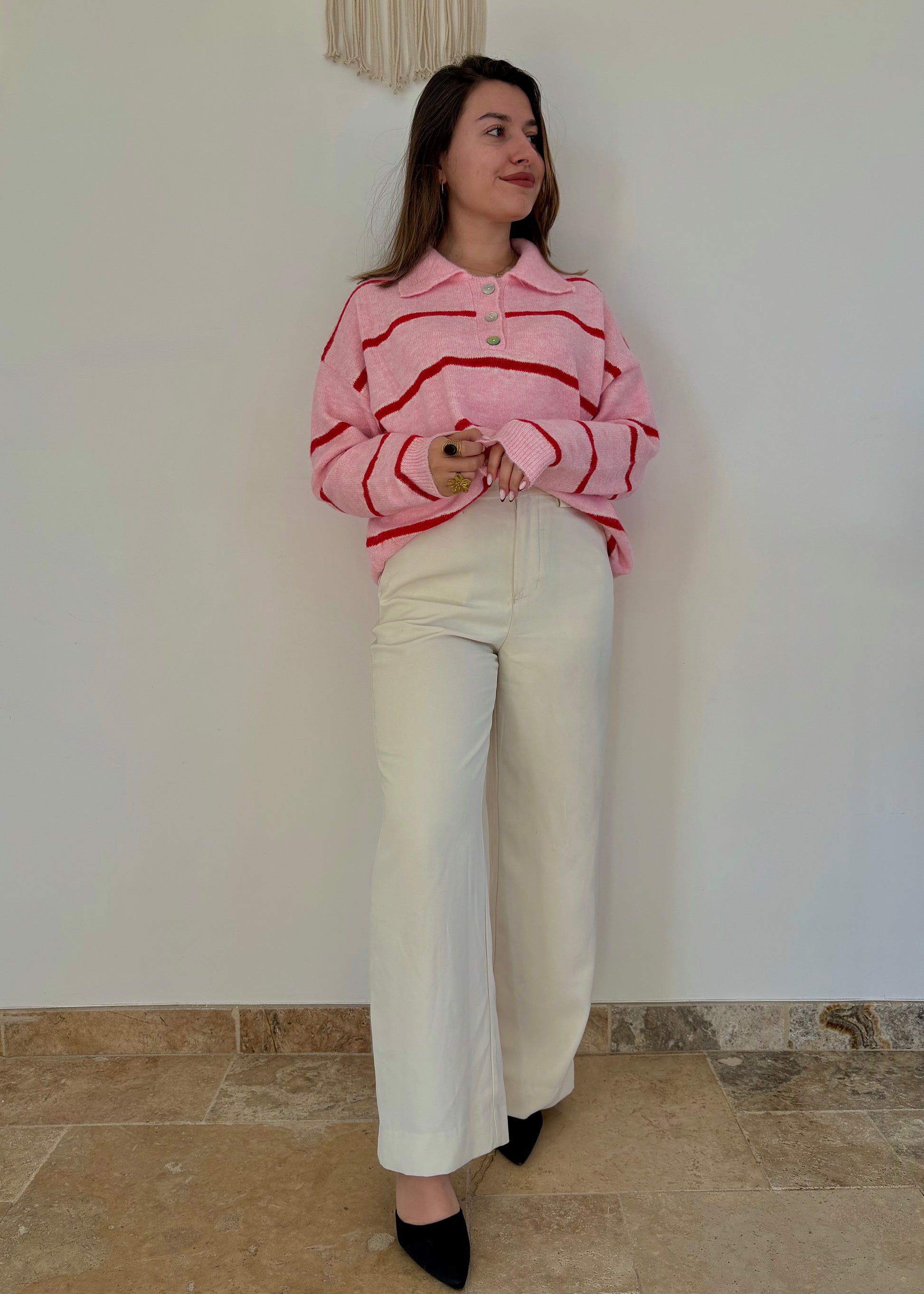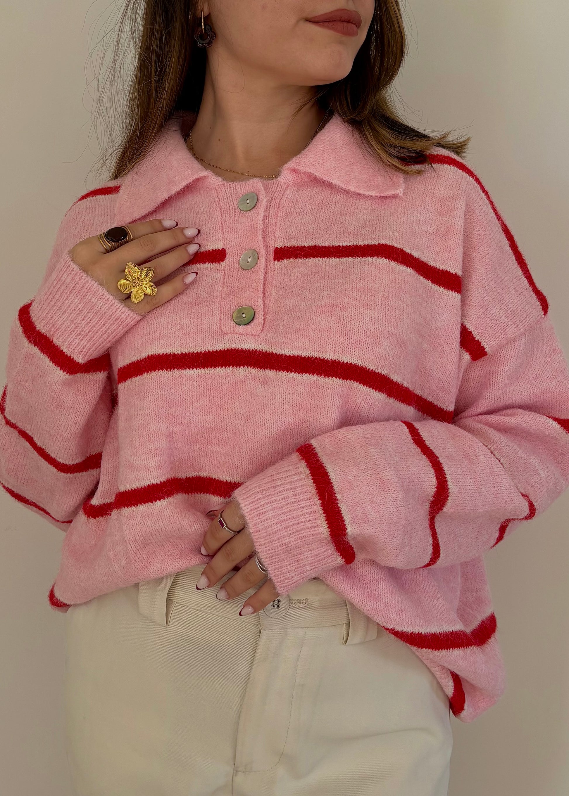 Avec son esprit polo et son col incroyable, ce pull rose à rayures rouges se démarque par son style affirmé. Sa coupe droite et sa maille chaude et douce offrent un confort absolu. Une pièce originale et moderne, parfaite pour illuminer vos looks tout en restant chic.