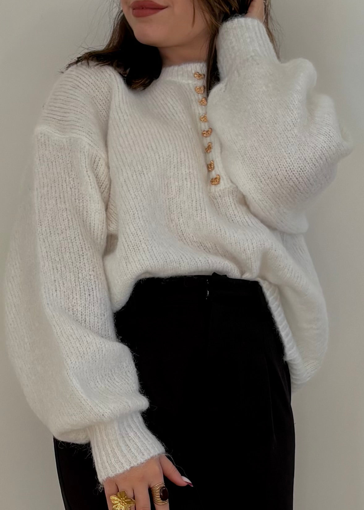 Épais, chaud et confortable, ce pull blanc séduit par sa maille douce. Son col rond intemporel est sublimé par une délicate lignée de boutons à bride en forme de cœur brillant, un détail chic et raffiné qui fait toute la différence.
