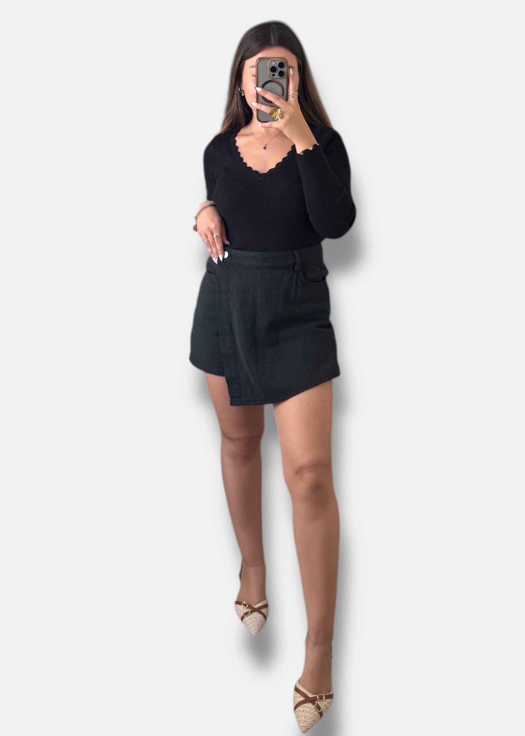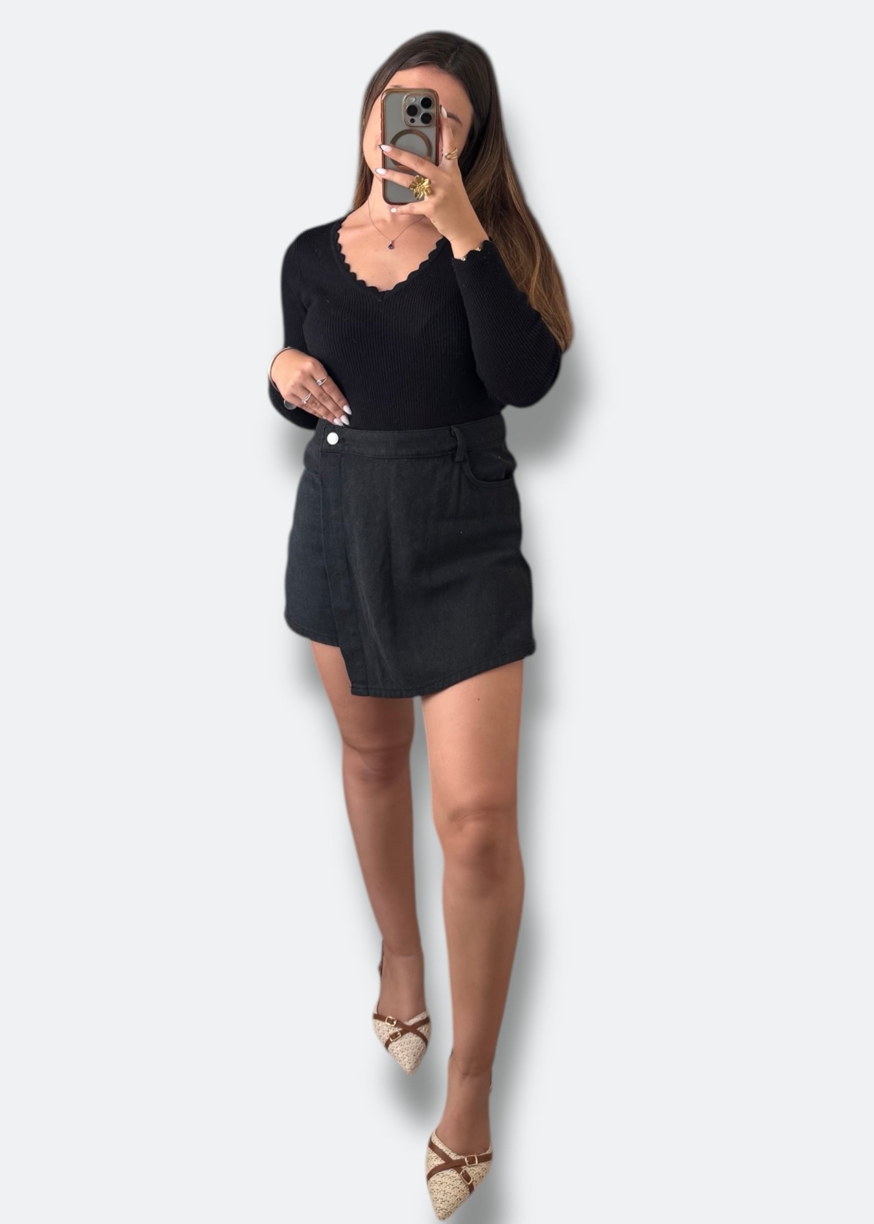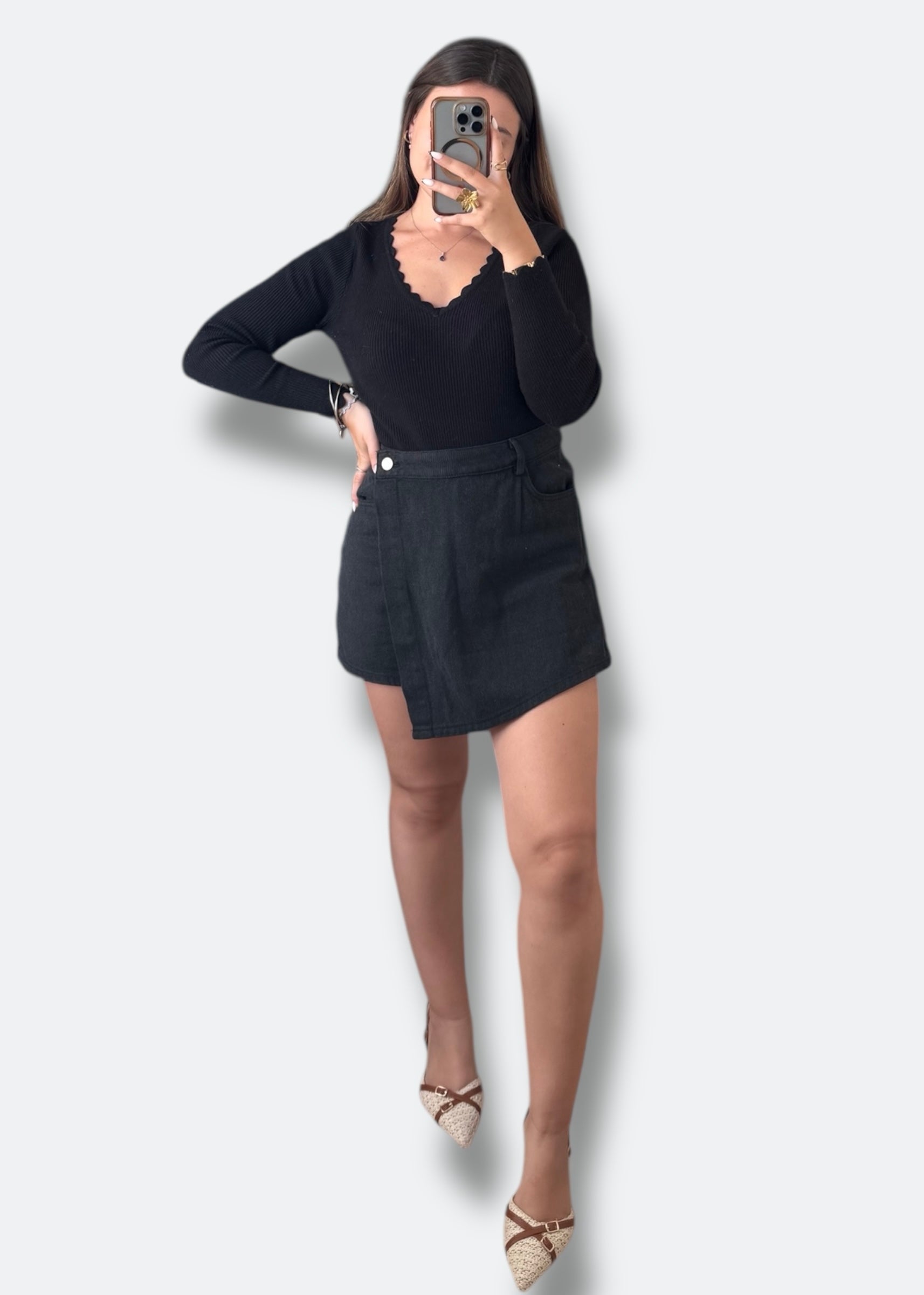 En maille côtelée, il se porte seul ou même sous un pull en hiver. Son col en V et les jolies petites vaguelettes tout le tour de l’encolure et sur le bas des manches ajoutent LE détail original de ce basique. Doux et agréable à porter, il s’adapte à toutes les occasions.